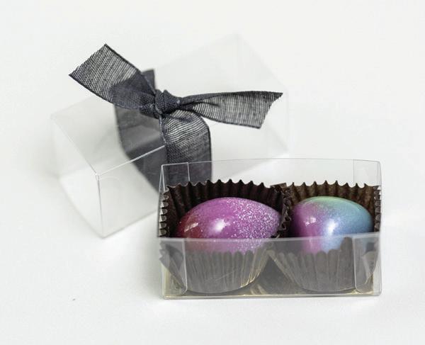Present your bespoke two-piece chocolate assortment in a clear gift box enclosed with a tied satin ribbon. The perfect size for gifting as an elegant favor.