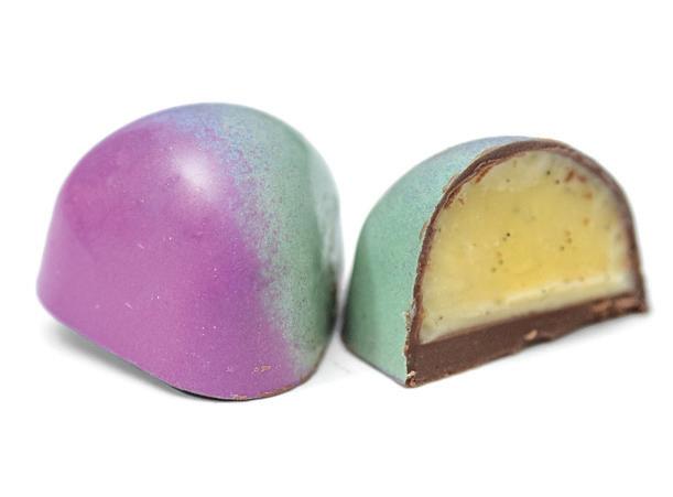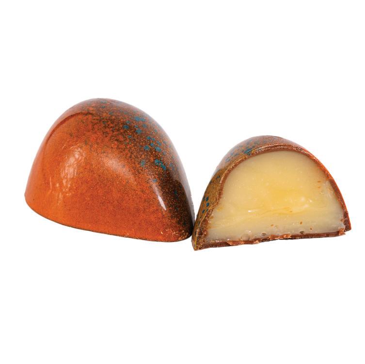 Milk chocolate shell with passion fruit juice infused butter caramel