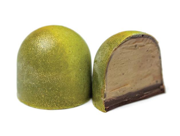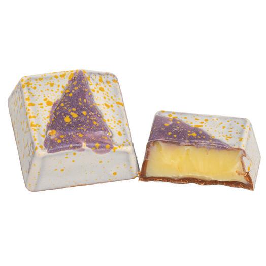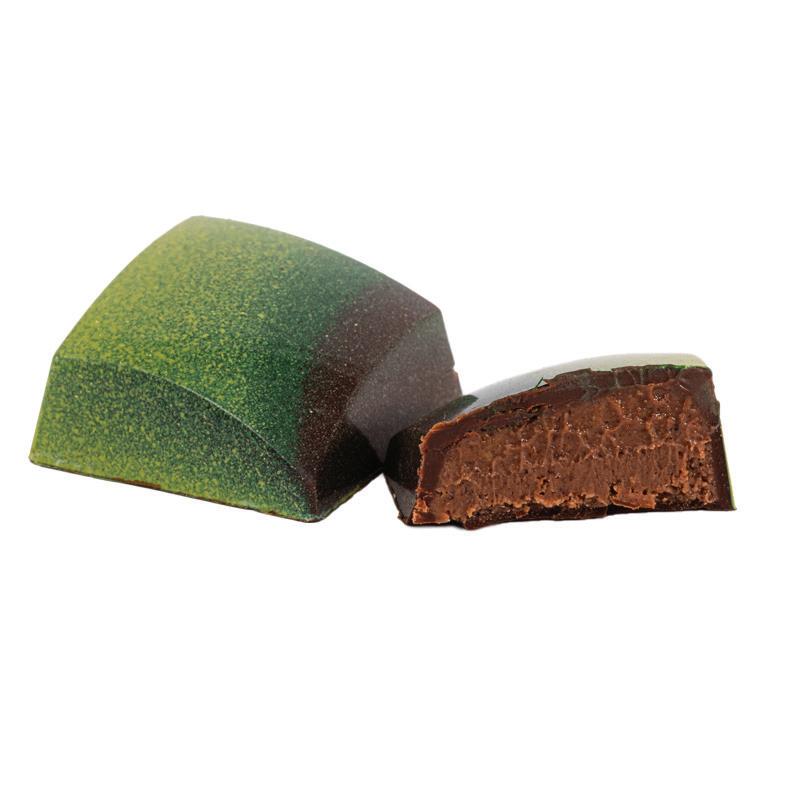 Hand-painted milk chocolate shell filled with white chocolate ganache infused with a Williams pear flavoring.