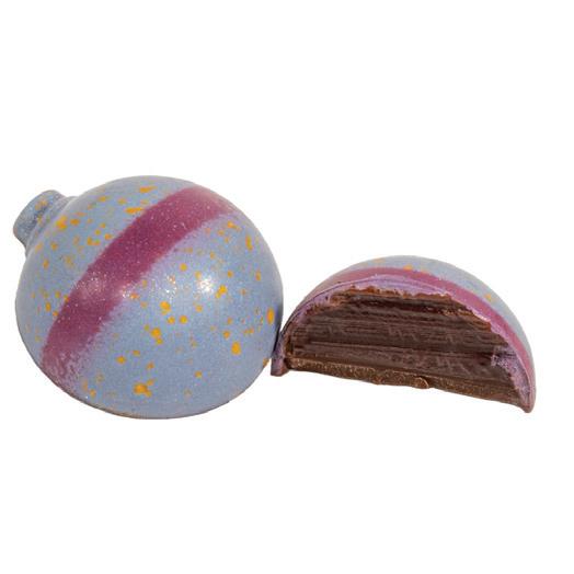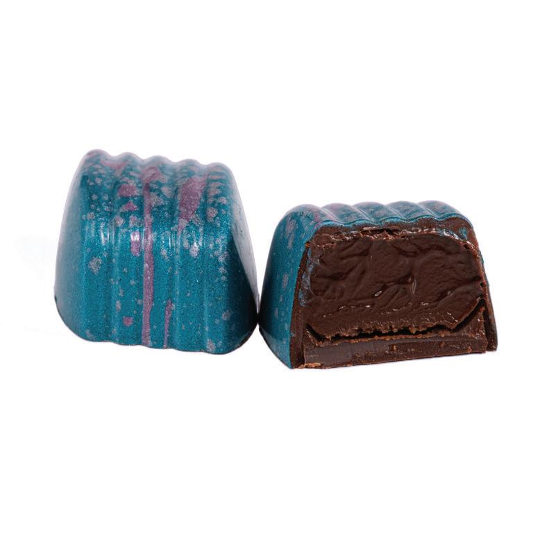 Hand-painted dark chocolate shell filled with pecan milk chocolate praline.