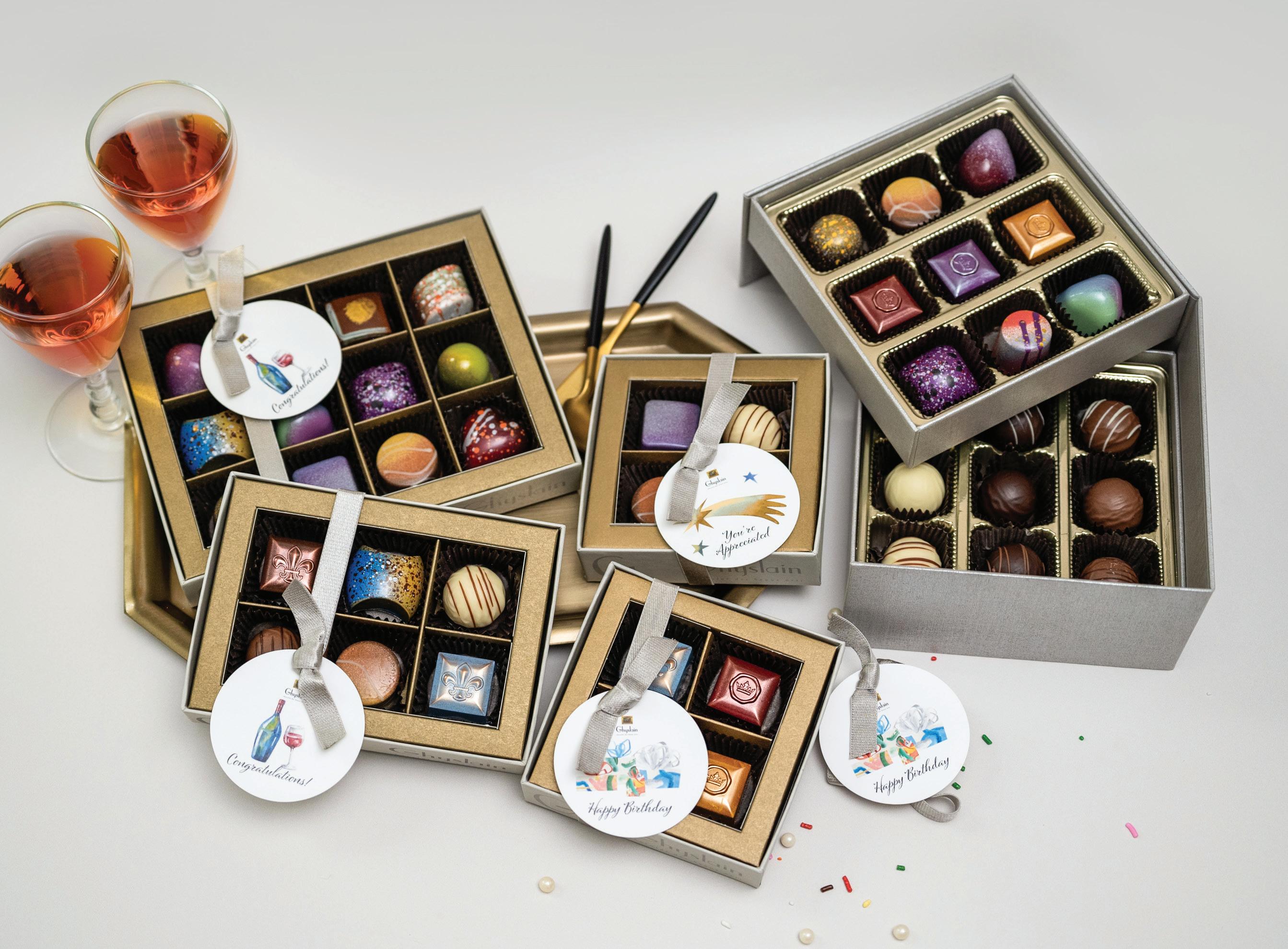 Select from our delicious chocolate collections—Signature, Truffle Harmonie, Collection de Caramel, Le Montage, or Turtle Mosaique. Each box is elegantly personalized