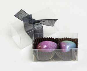 A two-piece chocolate assortment presented in a clear gift box enclosed with your custom logo satin ribbon. The perfect size for gifting as an elegant favor.