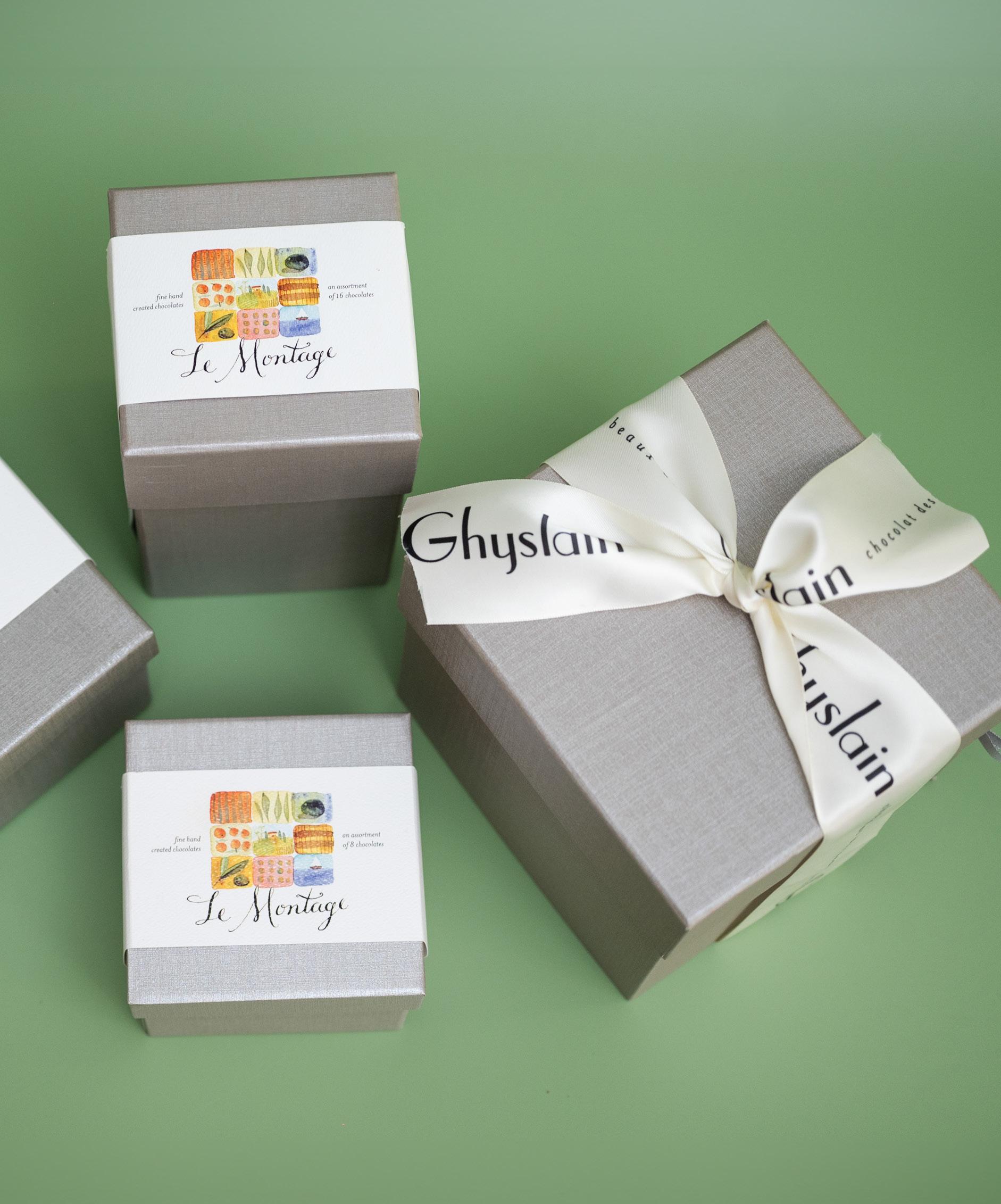 An assortment of gourmet chocolates from Ghyslain’s popular Signature and Truffle Harmonie collections beautifully presented in linen-textured silver metallic boxes enclosed with a branded watercolor paper bellyband.