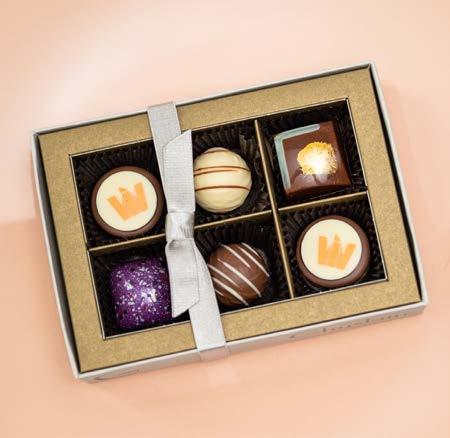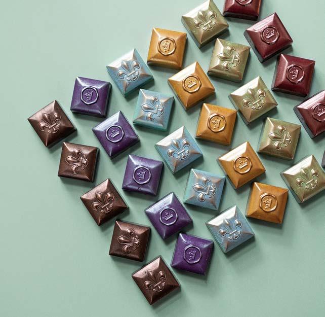 Featuring milk and dark chocolate shells filled with Ghyslain’s signature infused butter caramel. Each of six flavors are adorned with a crown or Fleur de Lis, beautifully hand-painted a brilliant metallic hue.