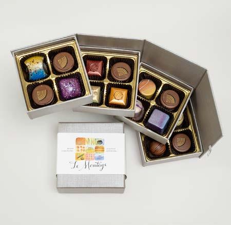 Present your bespoke chocolate assortment in one of our sophisticated multi-tiered silver metallic linen boxes enclosed with a branded Le Montage Collection watercolor belly band.