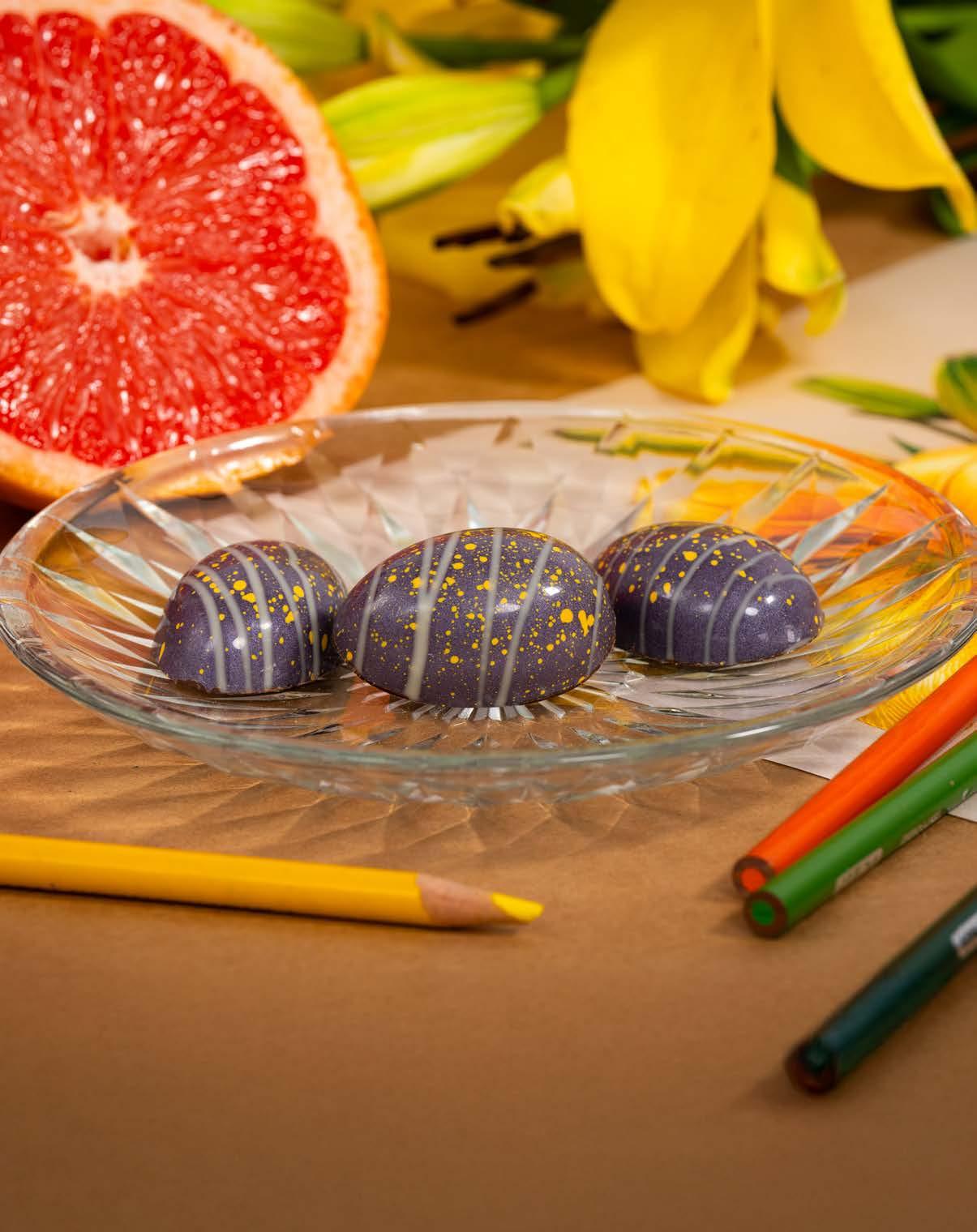 Hand-painted dark chocolate shell filled with white chocolate ganache infused with blood orange. E03