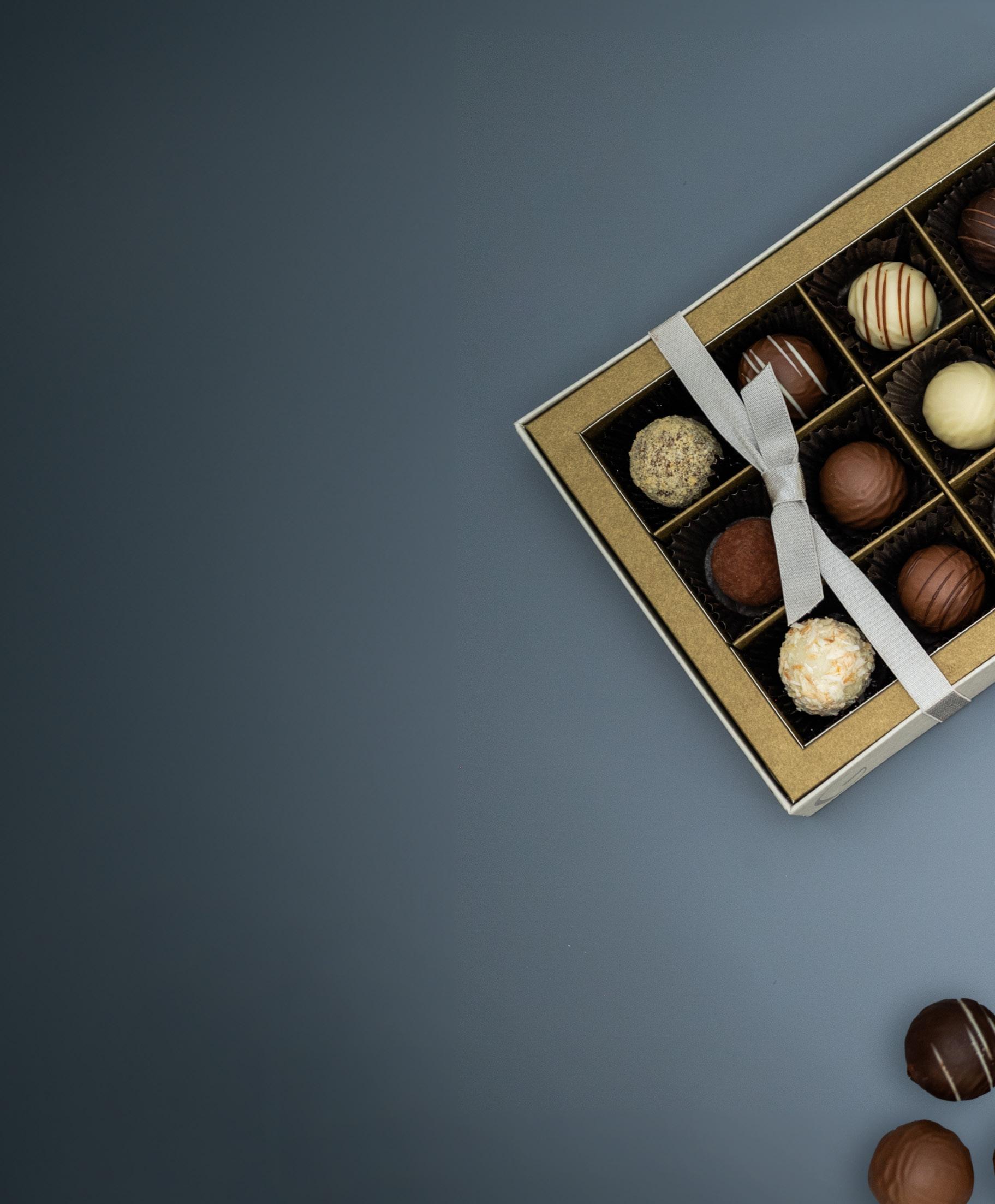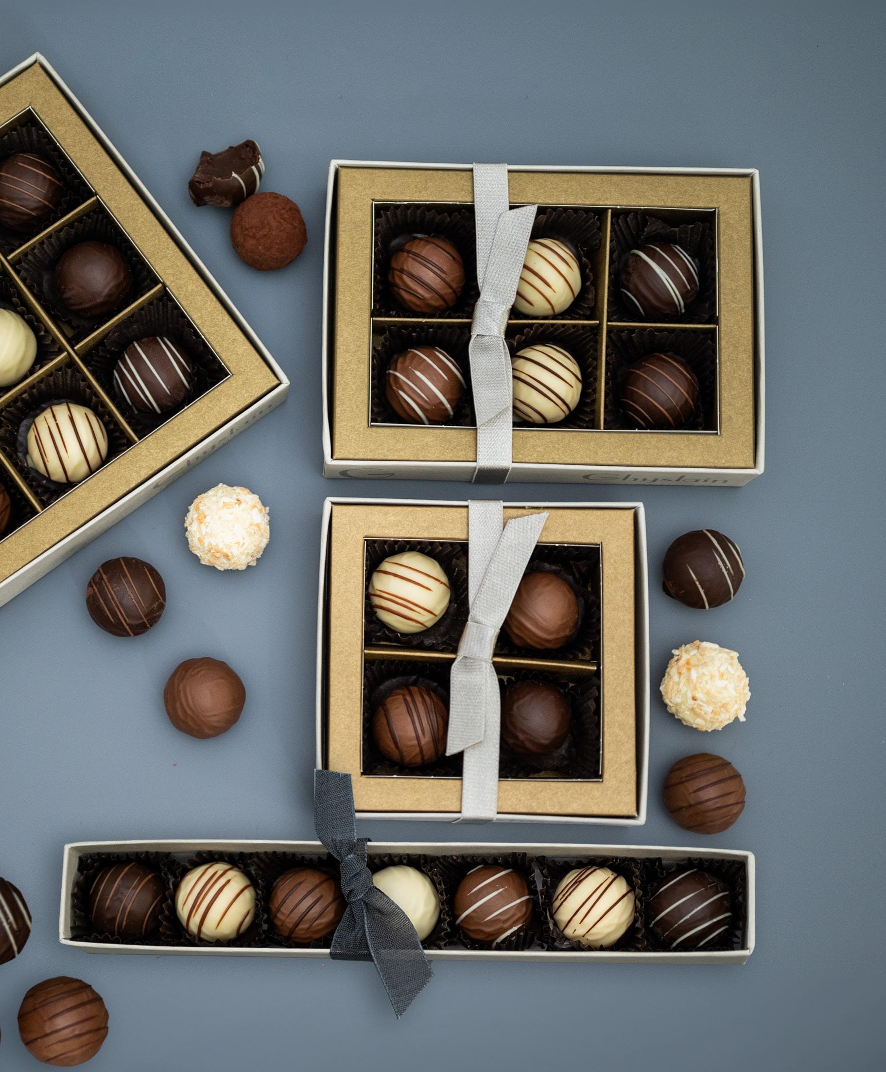 Our hallmark window boxes beautifully present hand-poured, ornately decorated gourmet chocolate truffles are blended with infused fresh cream with exotic extract essences. Each gourmet chocolate truffle is delicately dipped into one of three chocolate couvertures.