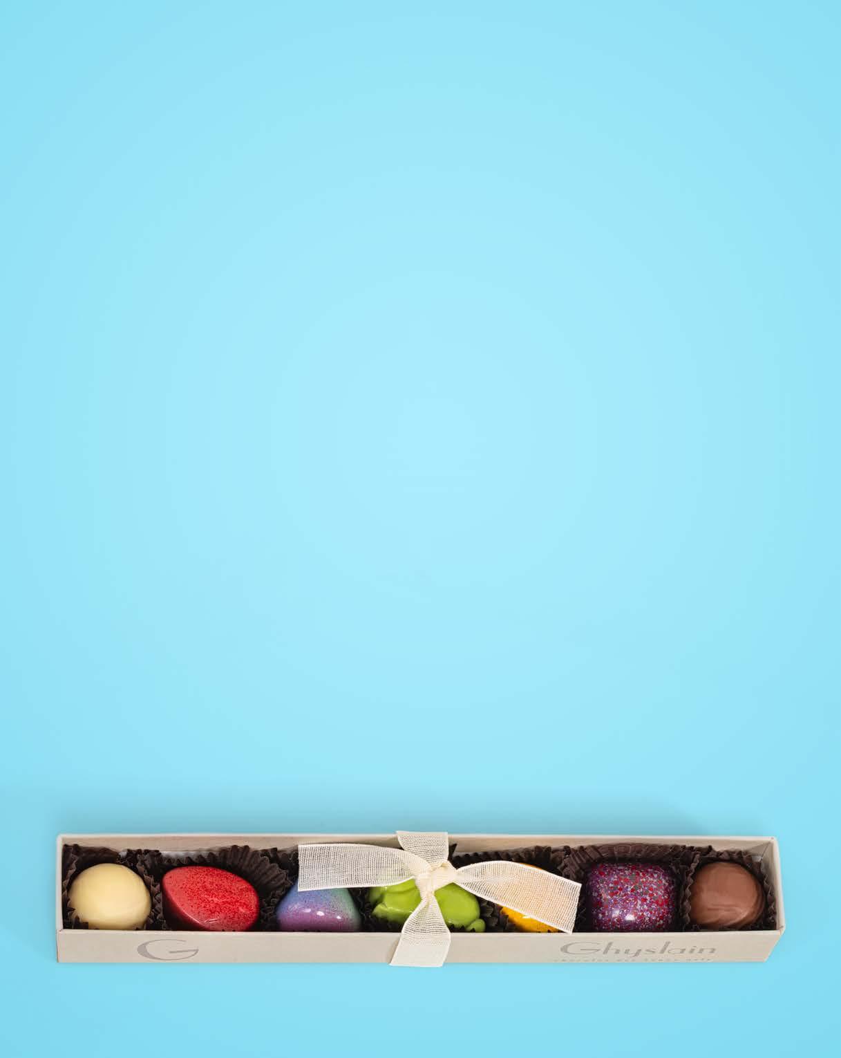 A seven-piece assortment selected from Ghyslain’s Signature, Truffle Harmonie and Easter Collections in an elegant sleeve, tied with a seasonal ribbon.