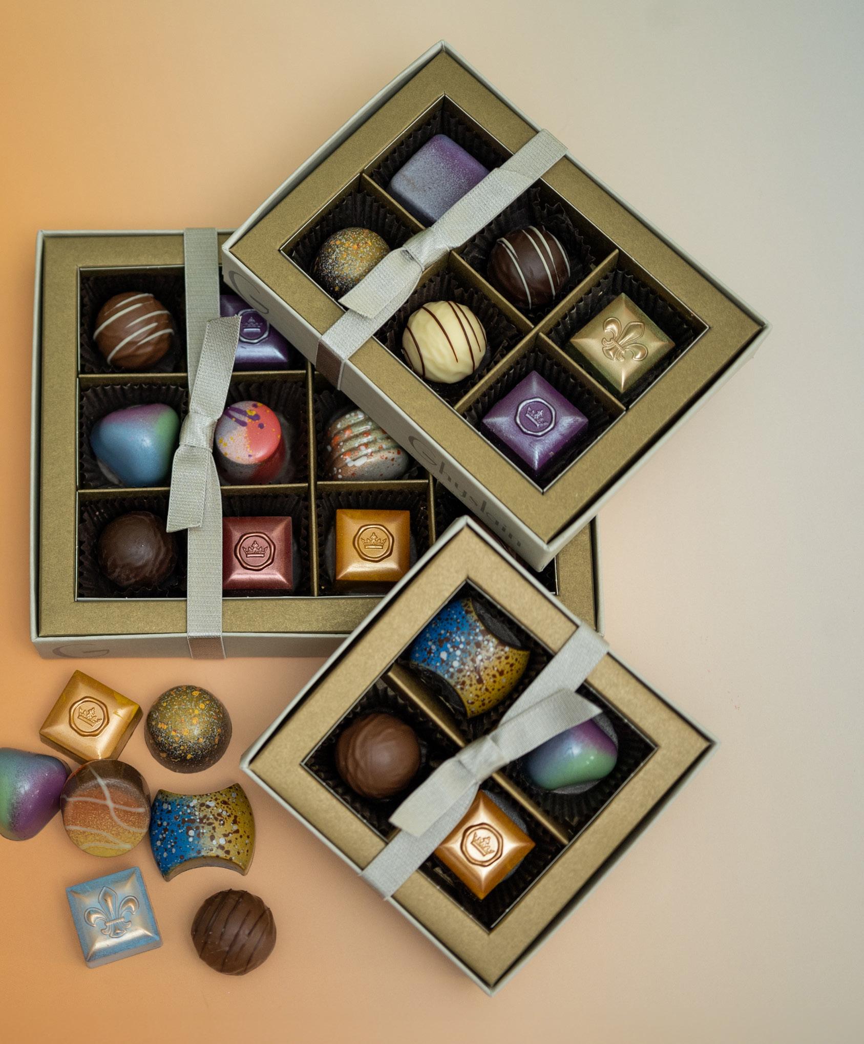 Featuring milk and dark chocolate shells filled with Ghyslain’s signature infused butter caramel. Each of six flavors are adorned with a crown or Fleur de Lis, beautifully hand-painted a brilliant metallic hue.
