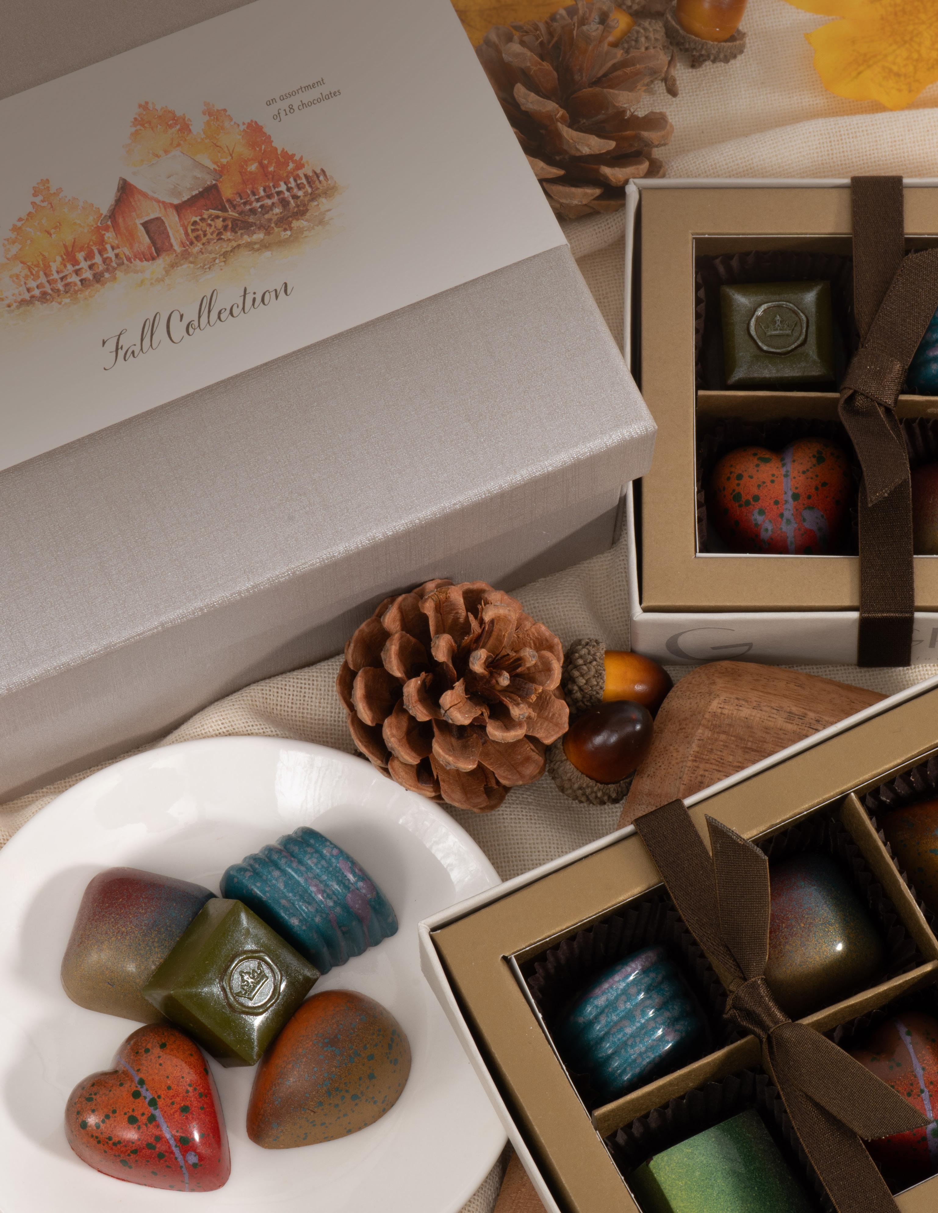 Our Fall Collection gourmet boxed chocolate assortments feature Ghyslain’s singularly bright colors, imaginative hand-painted decorations and delectable, one of a kind flavored ganaches crafted from the finest of ingredients. Each new season brings delightfully delicious new flavors.