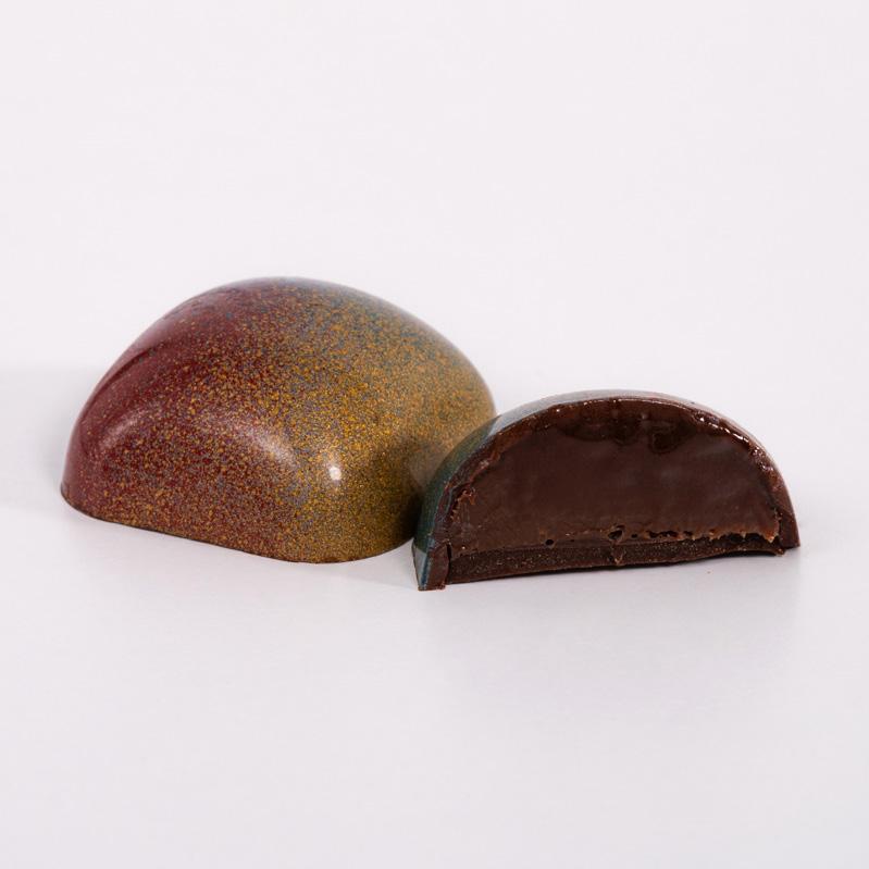 Hand-painted milk chocolate shell filled with white chocolate ganache infused with a Pear William flavoring.