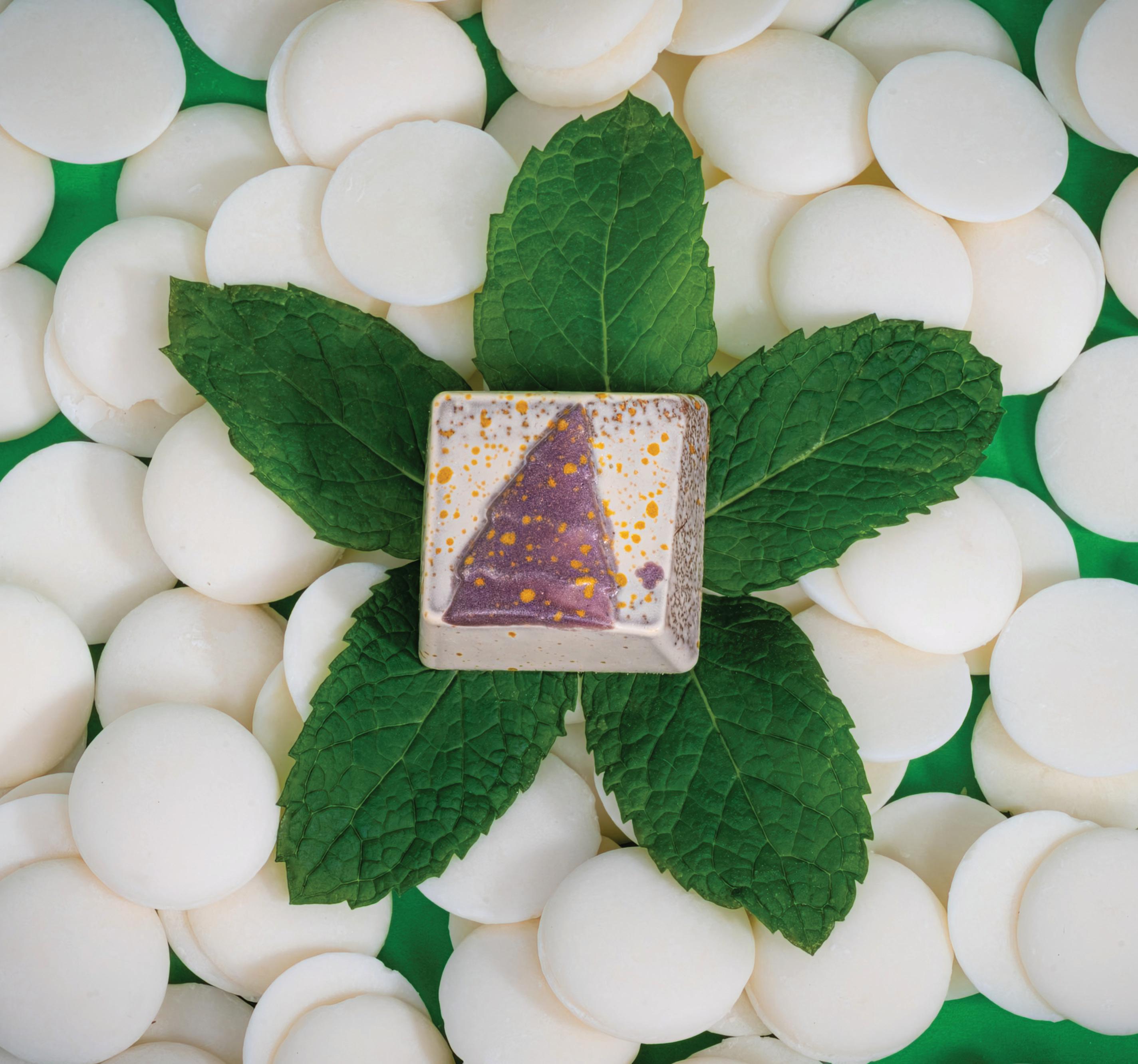 Hand-painted milk chocolate shell filled with white chocolate ganache with crème de menthe blanche and mint flavoring.