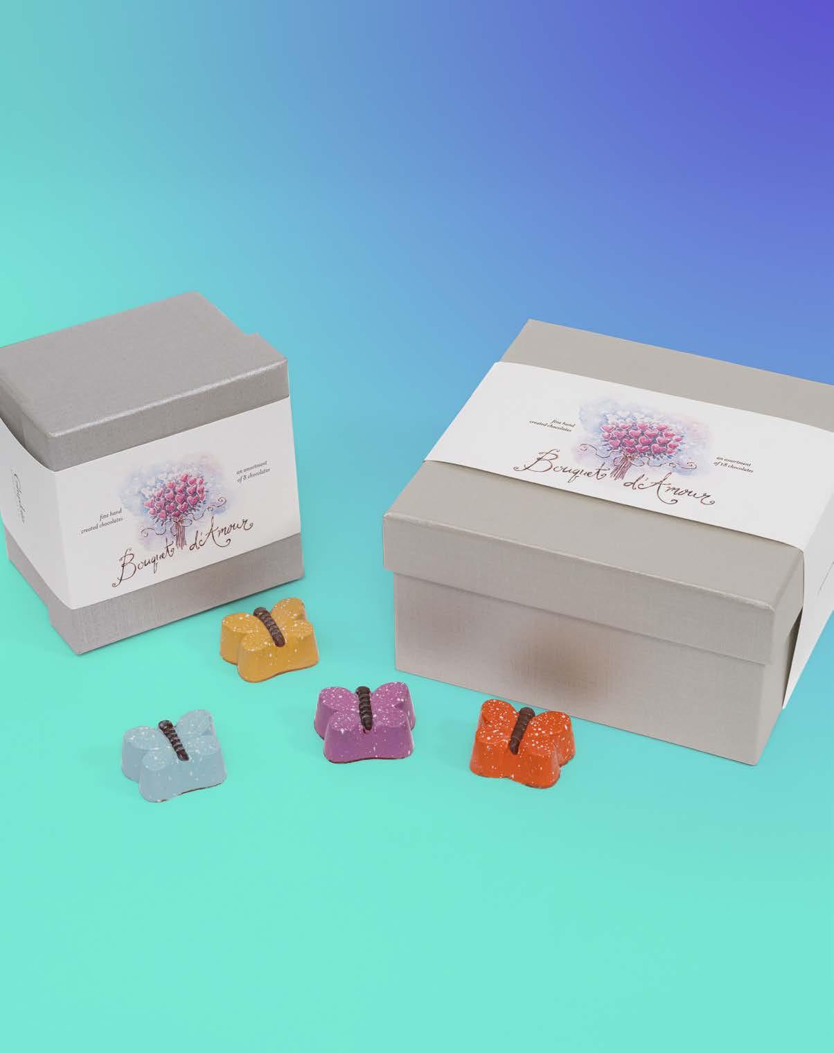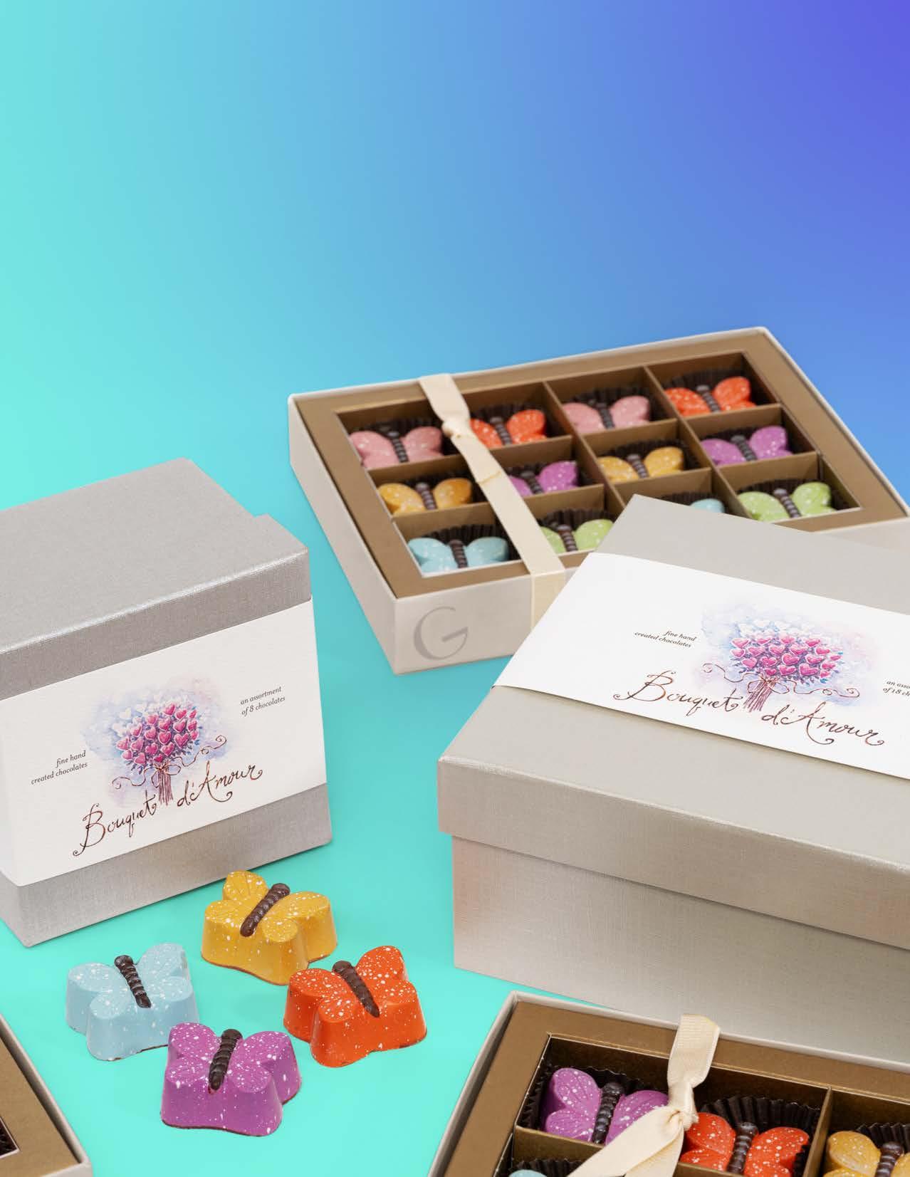 Ghyslain’s Butterfly Le Montage assortments feature delicious chocolates from our popular Signature, Truffle Harmonie, Collection de Caramel and Butterfly Collections, each presented in an elegant silver metallic gift box enclosed with a watercolor bellyband.