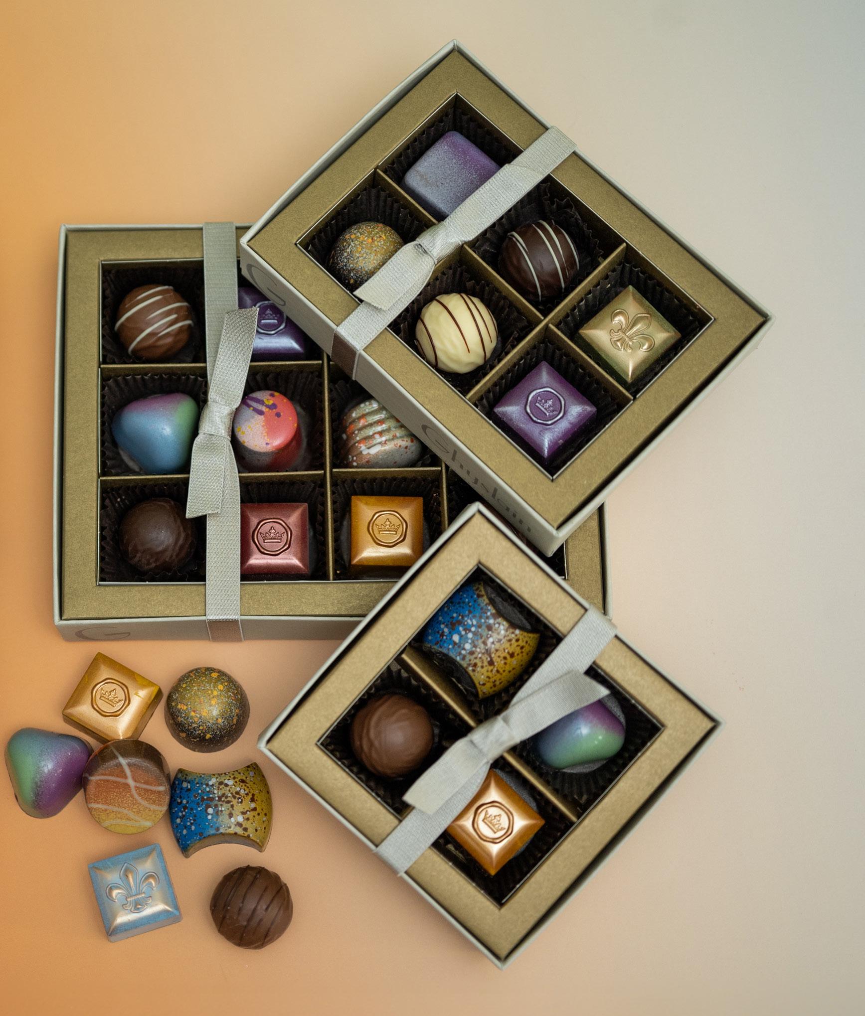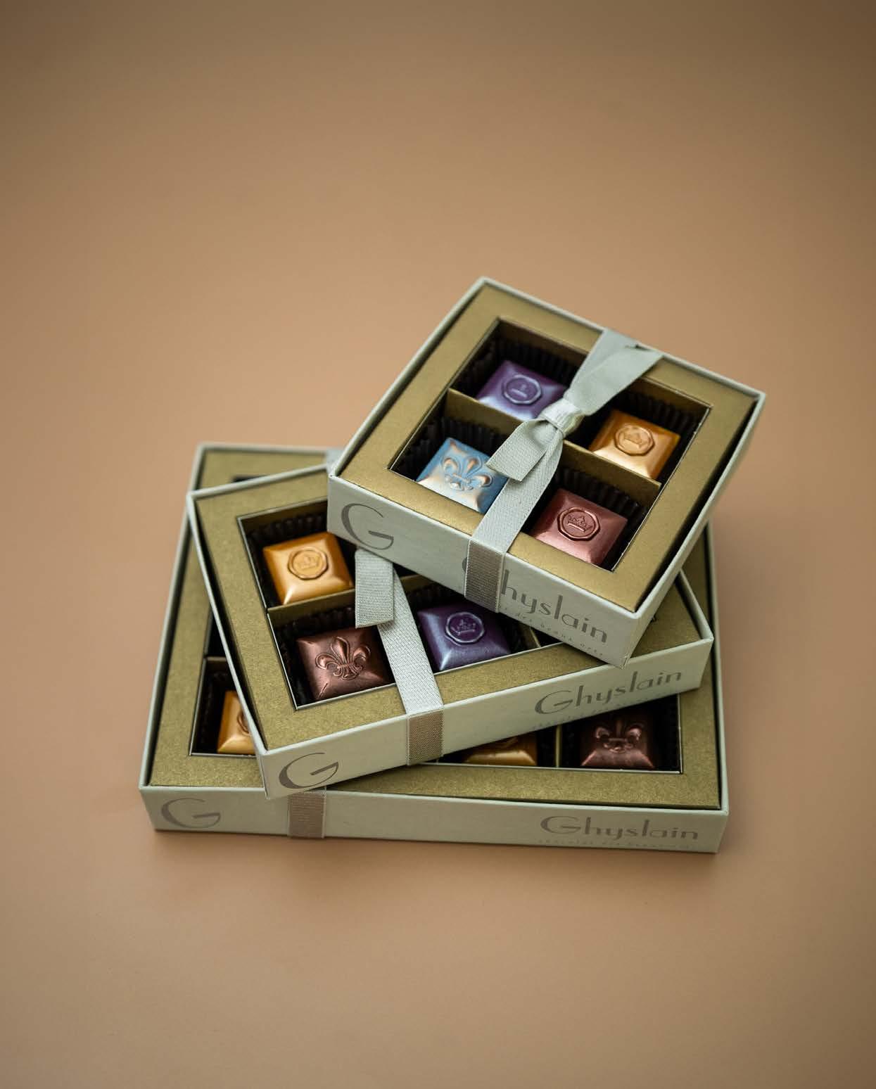 Our hallmark Ghyslain branded window boxes featuring a delectible assortment of chocolates exclusively from our Collection de Caramel.