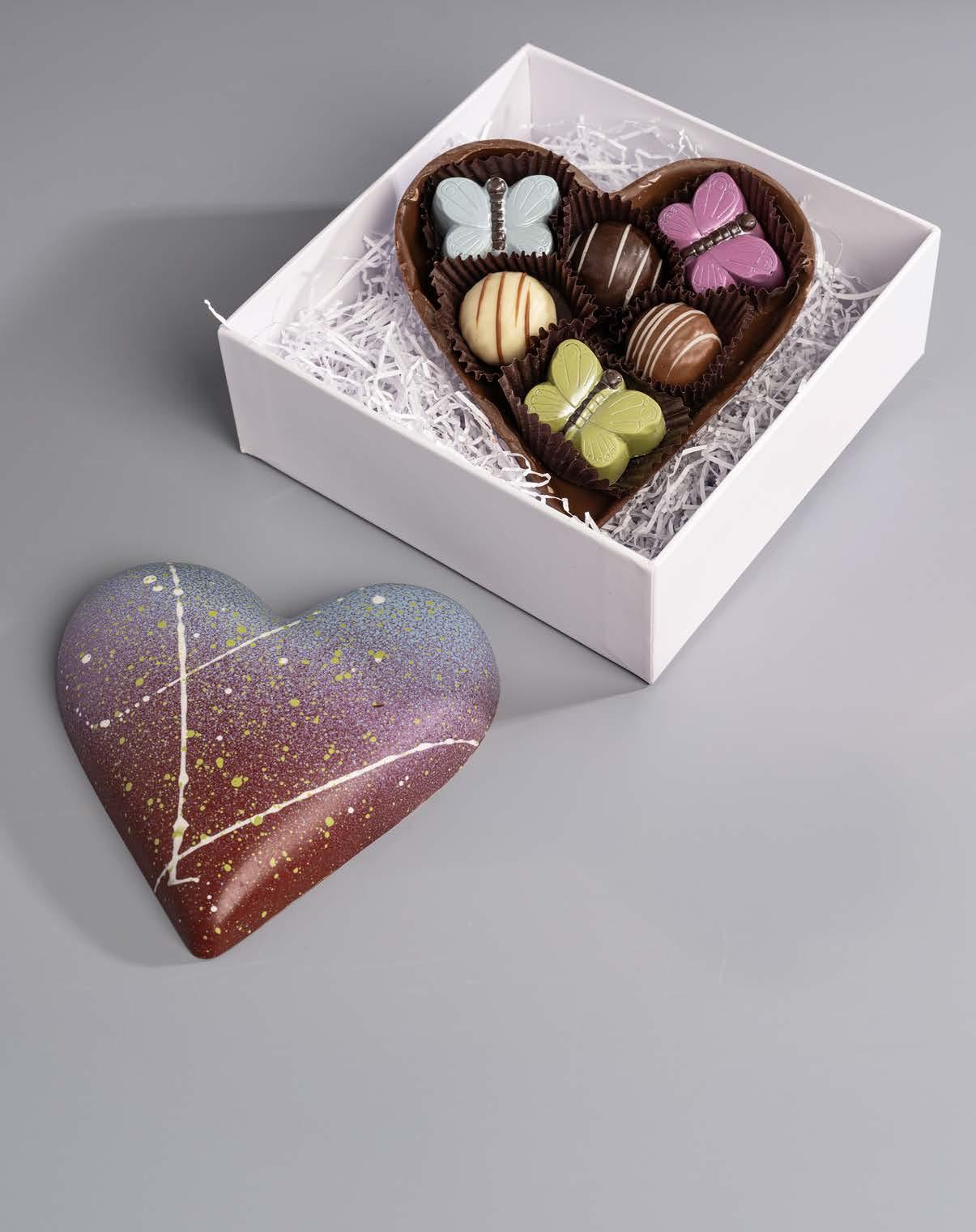 Our milk chocolate hand-painted heart box entirely edible filled with three of Ghyslain’s Seasonal Butterflies and three truffles from our Truffle Harmonie Collection. Presented in a white window box.