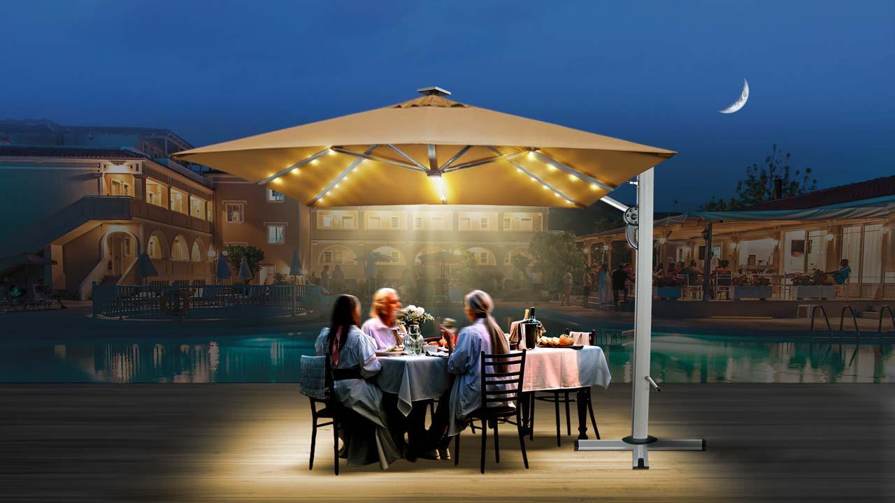 con palo laterale in alluminio, pratica apertura con manovella e supporto idraulico. Dotato di luci LED alimentate dal pannello solare, con possibilità di accendere solo la luce centrale o le stecche. Disponibile color ecrù