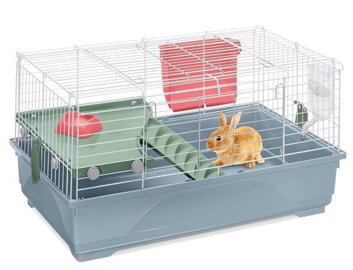 cm 80x48,5x42 h per conigli e porcellini d’india, con fondo in plastica riciclata e struttura metallica, dotata di ciotola, la mangiatoia per il fieno e il beverino