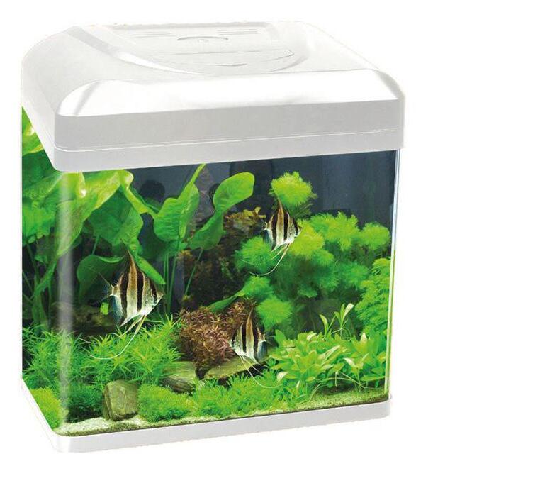 cm 42x27x36 h, capacità 30 lt acquario in vetro curvato, con filtro sottocoperchio, include pompa, materiali filtranti e illuminazione LED. Disponibile nei colori bianco e nero
