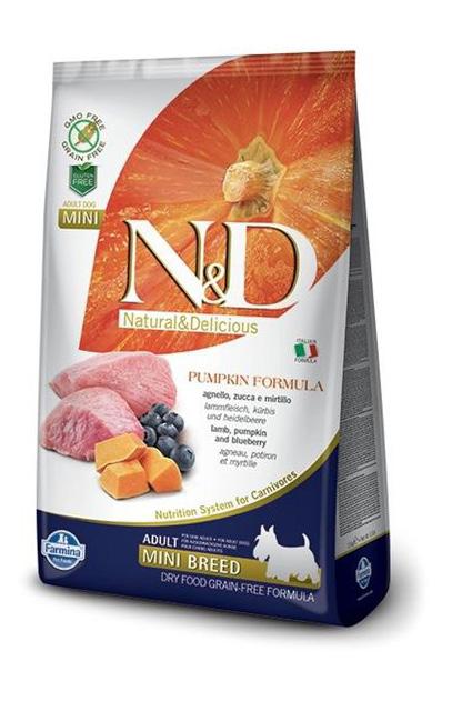 N&D GRAIN FREE PUMPKIN & BLUEBERRY 800 g alimento secco, completo per cani adulti di taglia piccola, con formula altamente digeribile, arricchita con zucca e mirtilli. Gusto agnello