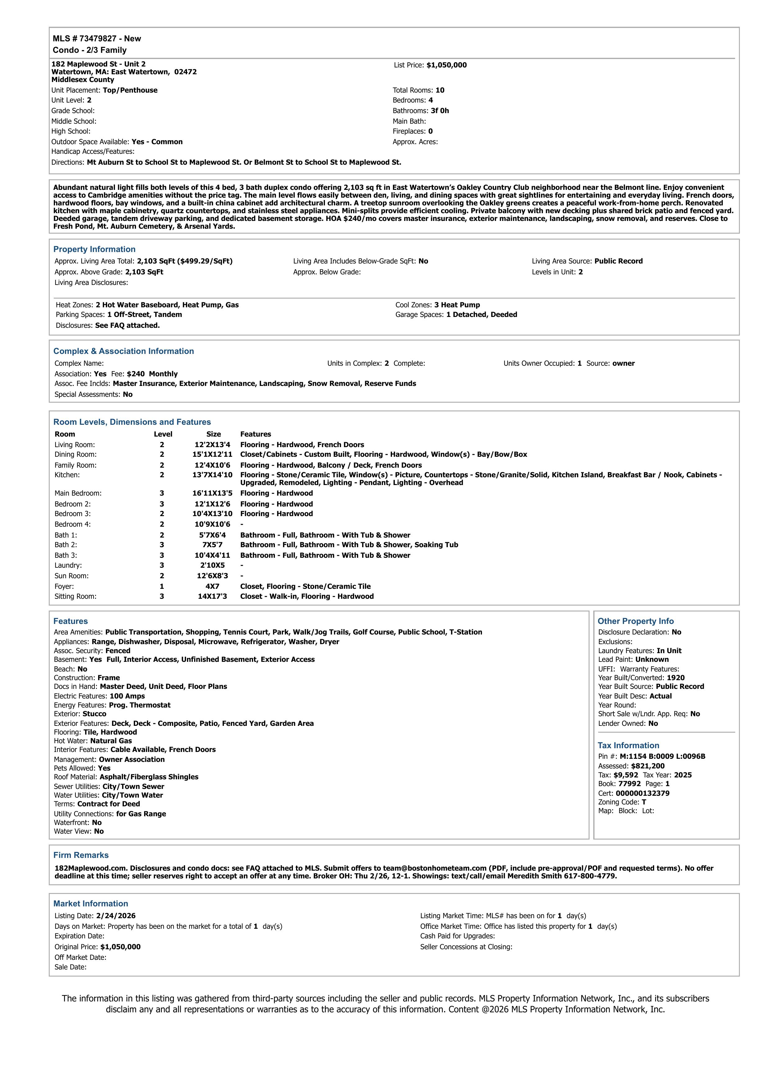 Address: 182 Maplewood Street #2, Watertown, MA 02472 Beds: 4 | Baths: 3 | Living space: 2103 | 2 pkg (1 garage)