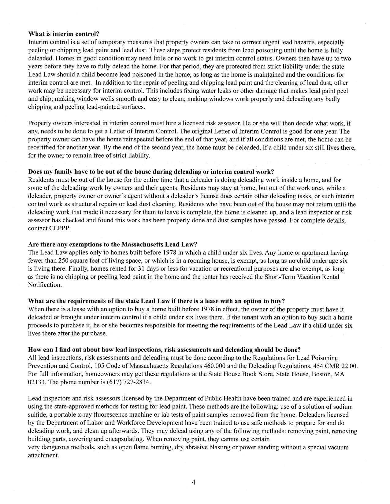 The BUYER may, at the BUYER's own expense and within ten (10) days after the acceptance of this agreement, have the property professionally inspected for the presence of paint, plaster or other accessible materials containing dangerous levels of lead (as such terms are defined by applicable Massachusetts laws and regulations) A copy of the inspector's report shall be furnished to the SELLER upon receipt by the BUYER If it is the opinion of such inspector that any such materials are present on the property, then the BUYER shall have the option of revoking this agreement by written notice to the SELLER and/or the Broker representing the SELLER prior to the expiration of such time In the event the BUYER revokes the agreement consistent with the terms of the above selected Contingencies, then any deposits made by the BUYER shall be forthwith refunded, and this agreement shall be null and void and without further recourse to either party