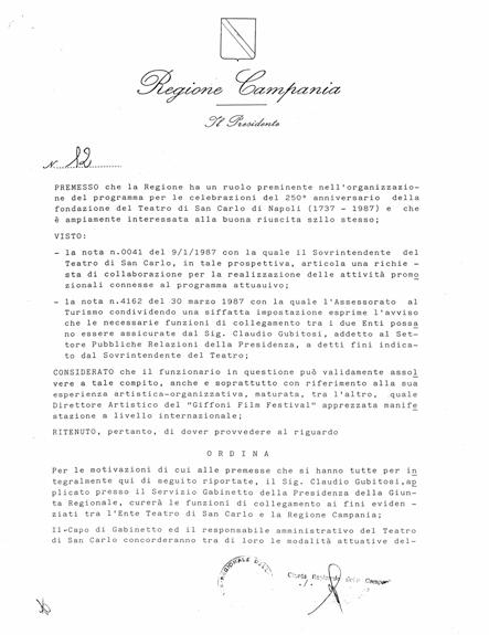 Nel 1987 sono stato il delegato della Regione Campania per l’organizzazione delle celebrazioni del 250° anniversario del Teatro San Carlo di Napoli.