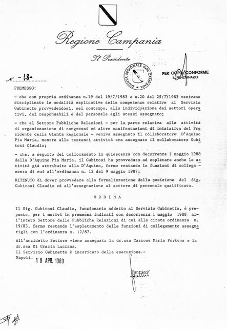 Dal 1980 al 1992 sono stato dipendente del Comune di Giffoni Valle Piana. Nel 1982, sono stato distaccato dal Comune alla Regione Campania dove, in qualità di funzionario, ho collaborato a numerosi progetti con l’Assessorato al Turismo diretto da Salvatore Armato e con l’Assessore alla Cultura Mario Sena. Con il mio impegno in Regione ho favorito il restauro del Complesso Monumentale San Francesco di Giffoni Valle Piana. Nel 1982 sono stato nominato Responsabile delle Pubbliche Relazioni della Presidenza della Giunta, incarico che ho mantenuto fino al 1990 realizzando, per la prima volta, l’Ufficio Pubbliche Relazioni della Regione Campania. Durante la mia permanenza in Regione ho sostenuto la creazione della Legge Regionale per l’istituzione della Cineteca della Campania. Questa norma ha visto la luce nel 1982 sulla base di un testo che ho elaborato. Un’altra iniziativa importante che ho portato avanti è la legge per la lettura del giornale in classe in tutte le scuole della Campania.
