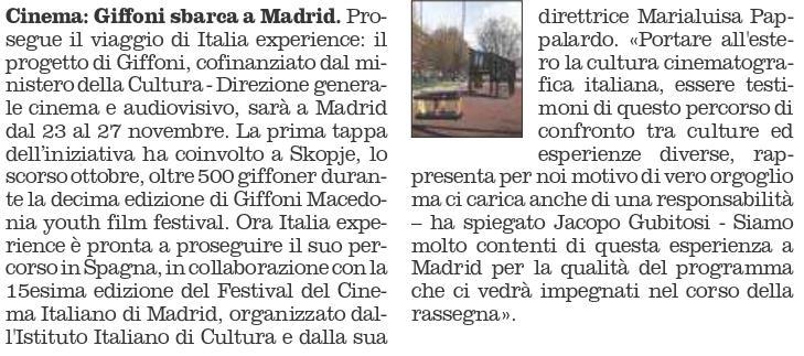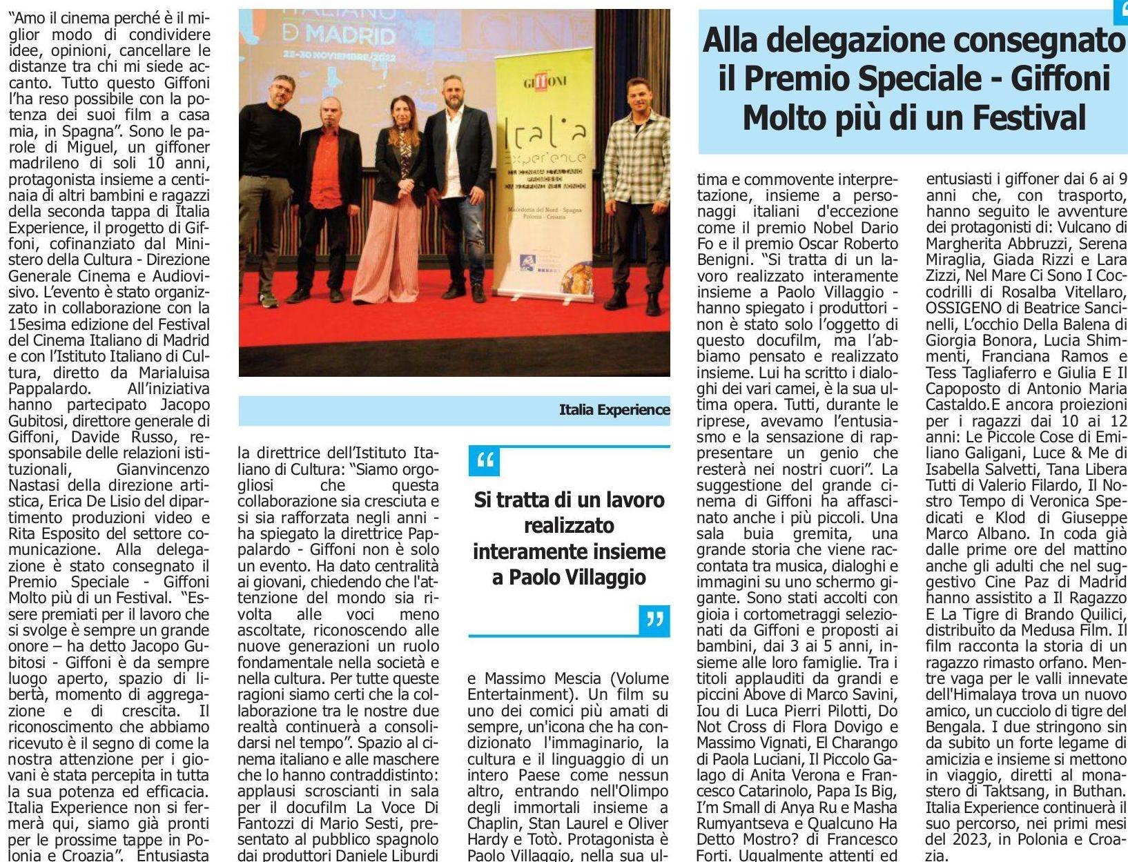 Experience:il progettodi Giffoni FilmFestivalchesaràaMadridda domaniadomenica.Dopola Macedonia,Italia Experienceora prosegue il suopercorsoin Spagnancollaborazioneconla lSesimaedizionedelFestivaldel CinemaItalianodi Madrid, organizzatodall'IstitutoItaliano di Culturaedallasuadirettrice MarialuisaPappalardo.La serata inauguraleèin programma domanipressoTlstitutoitaliano di cultura.All'eventoparteciperà JacopoGubitosi,direttore generaledi Giffoni, DavideRusso, responsabiledeirapporti istituzionali,Gianvincenzo Nastasidelladirezioneartistica, EricaDe Lisiodeldipartimento produzionivideoeRitaEsposito delsettorecomunicazione.Alla delegazioneverràconsegnatoil PremioSpeciale"Giffoni Molto piùdi unFestival".Siprosegue venerdì25novembreconla proiezionedeldocumentario "La Vocedi Fantozzi"di MarioSesti allapresenzadeiproduttori DanieleLiburdi eMassimo