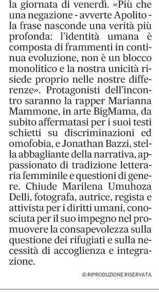 Gheno, sociolinguista, divulgatrice che si occupa di questioni di genere, diversità, equità e inclusione. Parte, invece, dall'assunto «Non è vero che siamo creativi», la giornata di giovedì 18 aprile. Protagonisti: Cristiano Godano, musicista, cantautore, scrittore e frontman della band Marlene Kuntz; Stefano Bartezzaghi, scrittore, critico letterario, professore all'Università Iulm Milano e giornalista. Sempre giovedì spazio a Fondazione Deloitte che presenterà il documentario Un punto preciso. Al termine della proiezione, a confrontarsi con i ragazzi sarà Marco Martinelli, divulgatore scientifico e tiktoker. «Non è vero che ci piacciono gli altri» è l'affermazione, volutamente irriverente, che guida la giornata di venerdì 19 aprile. E a parlarne con il pubblico sarà Marianna Mammone, in arte BIGMAMA, rapper reduce dall'ultimo festival di Sanremo. E ancora nella