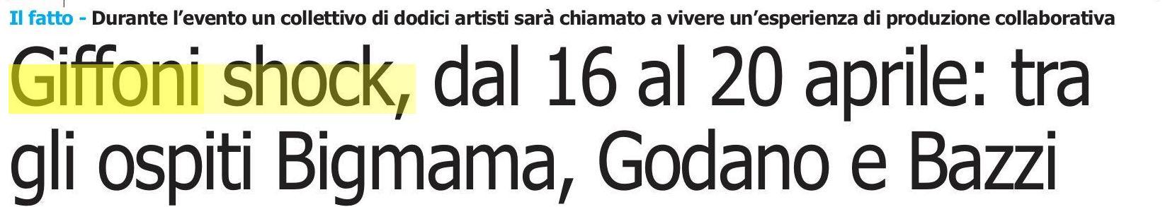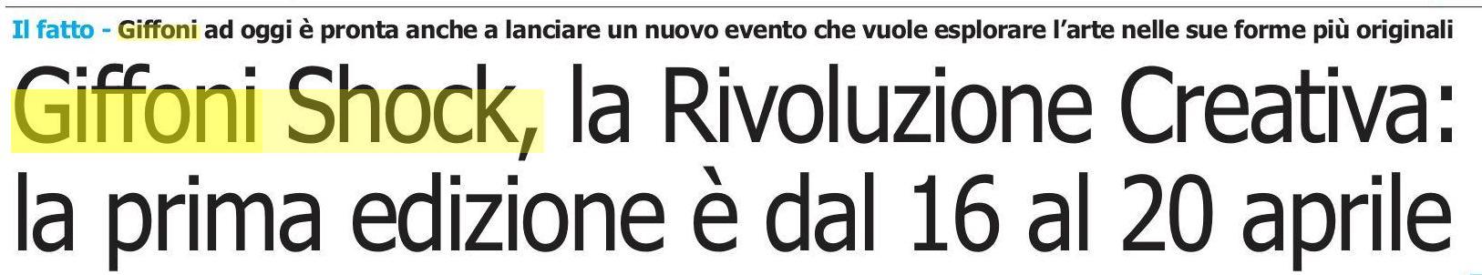 Dal 16 al 20 aprile negli spazi della Multimedia Valley (Giffoni Valle Piana, SA) si terrà la prima edizione di Giffoni Shock, cinque giorni di attività e incontri rivolti a ragazze e ragazzi, nel segno della contaminazione di generi, stili e di idee. Questa prima edizione parte da tre frasi provocatorie che raccolgono i temi fondamentali che saranno affrontati nel corso dell'evento: Non è vero che vogliamo essere felici, Non è vero che ci piacciono gli altri, Non è vero che siamo creativi. La sfida sarà di intercettare, attraverso il dialogo con esponenti del mondo della cultura, dell'arte e dell'attualità, gli argomenti adatti a contraddire e sovvertire queste tre negazioni. È l'occasione, dunque, per