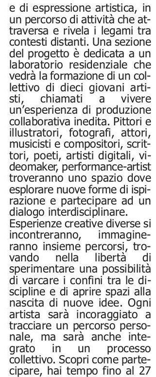 questa nuova generazione di abbattere stereotipi, di raccontarsi e definirsi con la propria voce e con le proprie idee. Tutto questo avverrà nella forma di show che mette insieme dibattiti, laboratori, performance, produzioni artistiche ed eventi dedicati ad alcuni dei temi più urgenti della contemporaneità. In programma anche una selezione di opere inedite che rappresentano le nuove forme e frontiere dell'espressione artistica contemporanea. Non solo cinema, dunque, ma spazio anche a tante altre forme di racconto e di espressione artistica, in un percorso di attività che attraversa e rivela i legami tra contesti distanti. Una sezione del progetto è dedicata a un laboratorio residenziale che vedrà la formazione di un collettivo di dieci giovani artisti, chiamati a vivere un'esperienza di produzione collaborativa inedita. Pittori e illustratori, fotografi, attori, musicisti e compositori, scrittori, poeti, artisti digitali, videomaker,