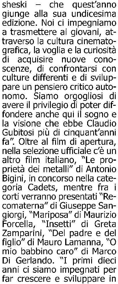 sheski — che quest'anno giunge alla sua undicesima edizione. Noi ci impegniamo a trasmettere ai giovani, attraverso la cultura cinematografica, la voglia e la curiosità di acquisire nuove conoscenze, di confrontarsi con culture differenti e di sviluppare un pensiero critico autonomo. Siamo orgogliosi di avere il privilegio di poter diffondere anche qui il sogno e la visione che ebbe Claudio Gubitosi più di cinquant'anni fa". Oltre al film di apertura, nella selezione ufficiale c'è un altro film italiano, "Le proprietà dei metalli" di Antonio Bigini, in concorso nella categoria Cadets, mentre fra i corti verranno presentati"Recomaterna"di Giuseppe Sangiorgi,"Mariposa" di Maurizio Forcella, "Insetti" di Greta Zamparini, "Del padre e del figlio" di Mauro Lamanna,"O mio babbino caro" di Marco Di Gerlando. "I primi dieci anni ci siamo impegnati per far crescere e sviluppare in