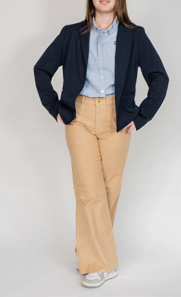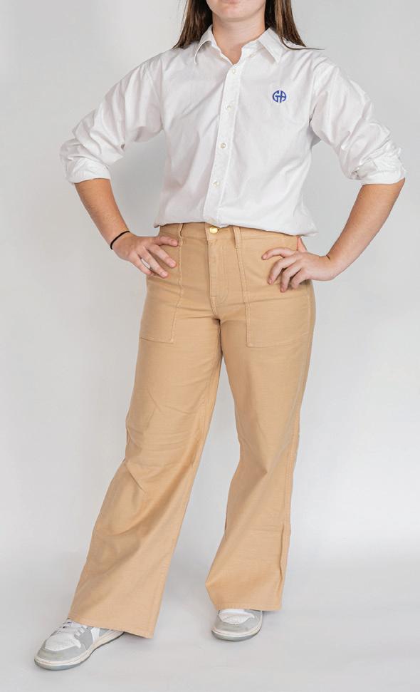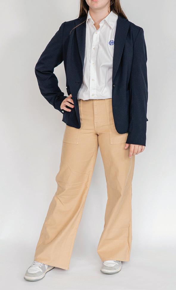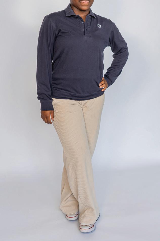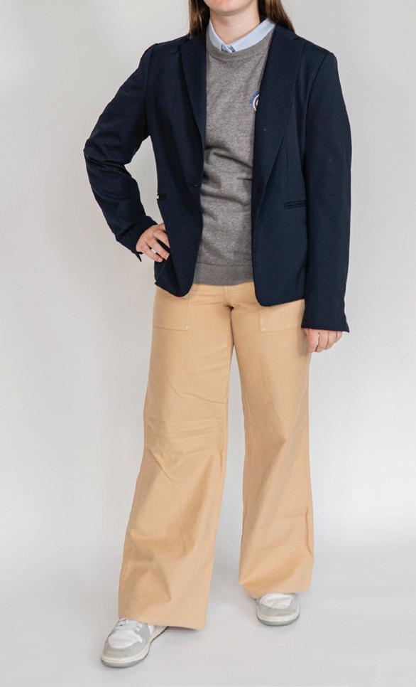 Students must wear dress pants, khaki-style pants or corduroys in the following colors: navy, khaki, gray, or black. Pants must extend to near the ankle and be worn at the waist. No jeans, flared yoga pants, flared leggings, shorts, colored denims, capri-length, bell-bottomed, cargo-style pants with exterior pockets, athletic pants, joggers, leggings or excessively tight pants are permitted.