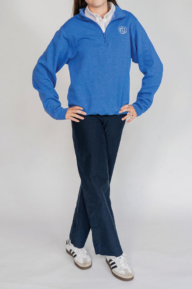 Students may wear a solid navy blue, royal blue or gray crew neck, v-neck or quarter-zip sweater or sweatshirt. Hoodies are not permitted. Sweaters and sweatshirts with no logo or with a small Gilmour emblem on the left side of the student’s chest are allowed.