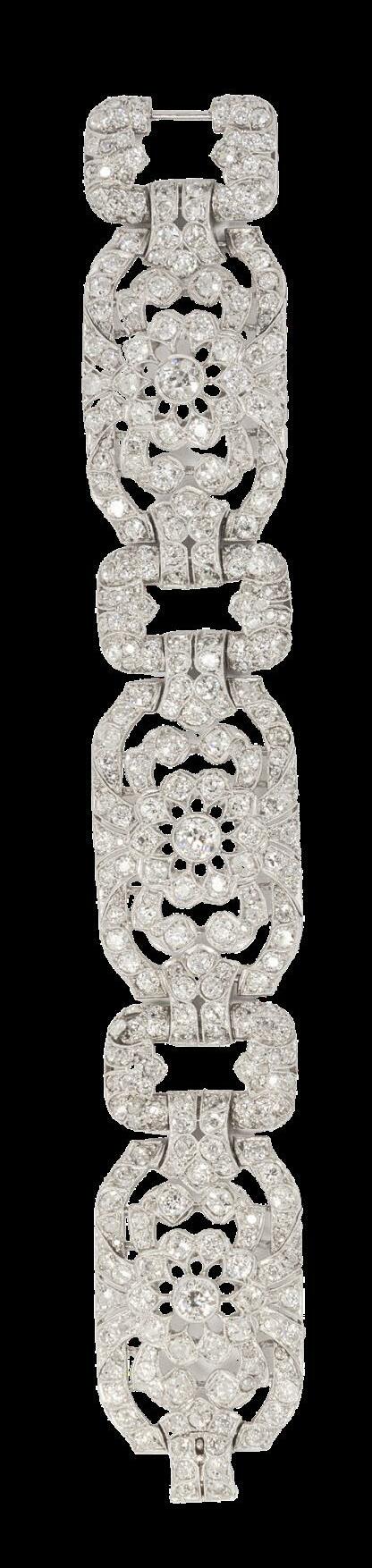 3 diamantes centrales en talla europea con un peso estimado de 1.57 ct, color I - J, pureza SI – I1, con 339 diamantes en talla europea antigua con un peso estimado total de 18.24 ct, blancos con ligeros detalles, diseñados en platino con un peso total de 62.3 gramos.. Hechos a mano, sin kinto grabado en la pieza. Circa 1910´s.