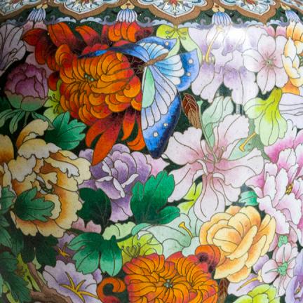 Geisha con kimono y canasto de flores sobre base con forma de dragones, flores, bambús y nubes. Elaborado en colmillo de marfil tallado y pintado a mano con tinta negra en el cabello. Base de marfil tallado a mano al relieve Circa 1970 Origen Japón.