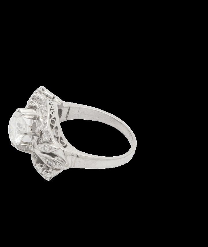 diamante central en talla brillante con un peso estimado de 1.12 ct, color estimado H, pureza SI2, 24 diamantes en talla sencilla con un peso estimado de 0.50 ct, blancos casi limpios, diseñado en plata paladio, sin sellos ni kintos.