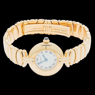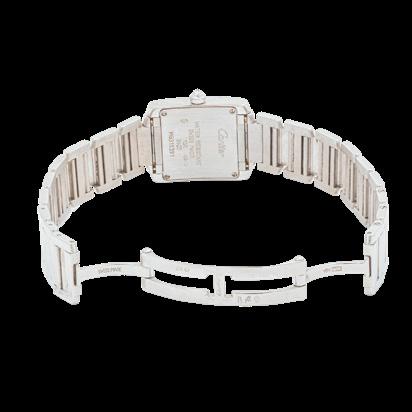 Modelo Tank Frances, para dama, con bisel con 24 diamantes, carátula blanca, números romanos en negro, cristal de zafiro, corona con 1 diamante. Maquinaria 057 de cuarzo. Modelo 2403, Serie MG319391. Diseñado en oro blanco de 18 kte.