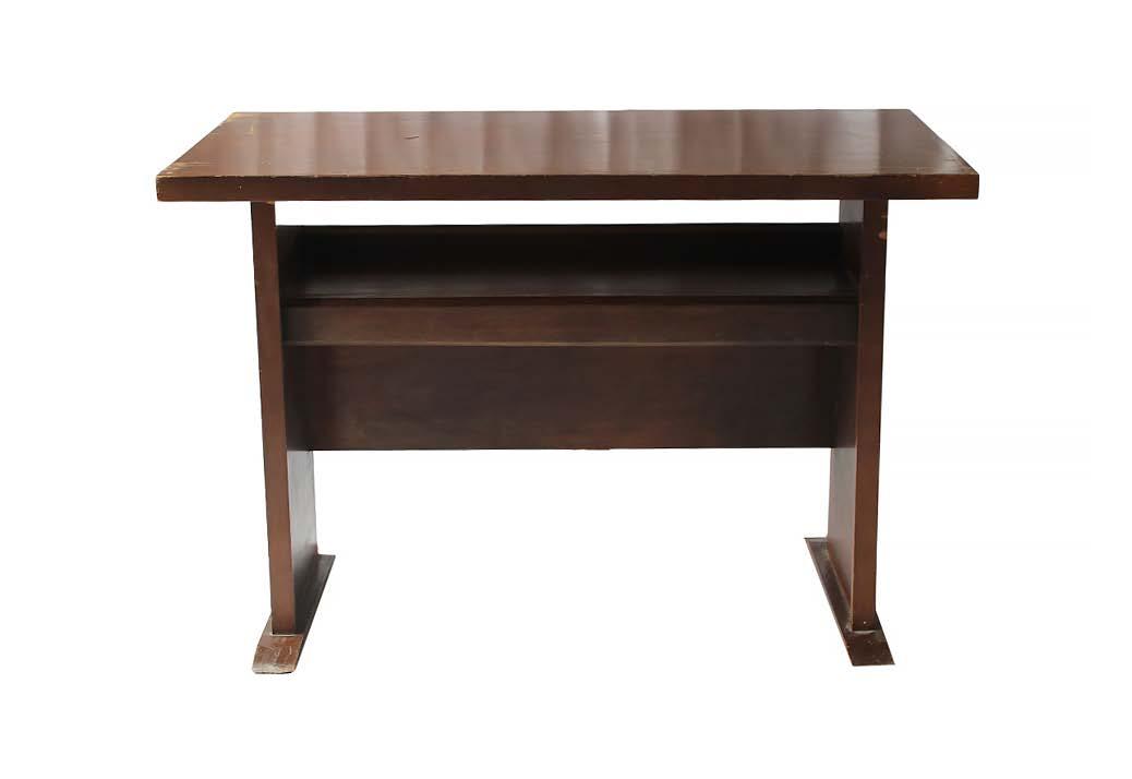 Diseño francés. Mesa con dos soportes laterales unidos por un tronco de madera. Decorada con motivos orgánicos, cruces y roleos. Elaborada en madera solida tallada y ensamblada a mano. Presenta señales de antigüedad.