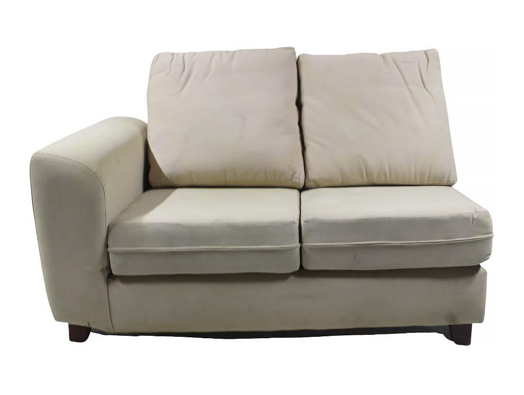 Sillón de dos plazas. Elaborado en madera tapizado en tela color hueso. Presenta detalles.