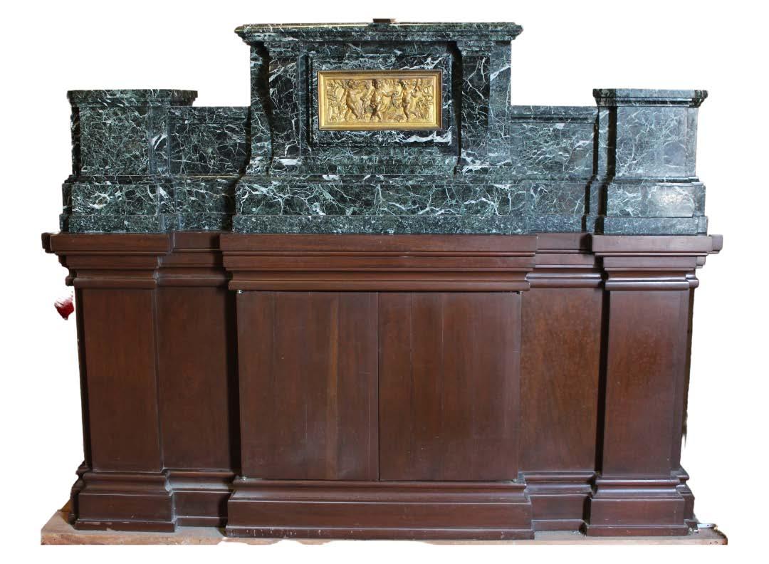 Elaborada en madera con interiores en mármol rosa emperador y espejos. Cuenta con preparación eléctrica.
