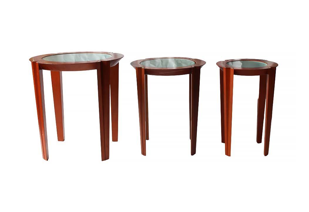 Superficie redonda. Elaboradas en metal plateado con superficie de vidrio biselado de 6 y 12 mm. Una de ellas cambia de altura.