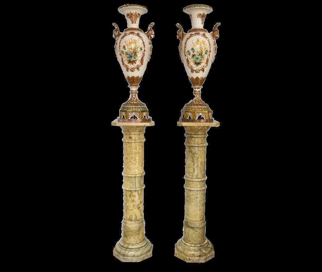 Tibores elaborados en cerámica esmaltados y pintados a mano sobre columnas elaboradas en mármol color gris veteado 2 tibores y 2 columnas en total