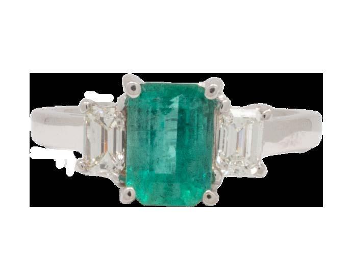 1 esmeralda colombiana central en talla esmeralda con un peso estimado 1.20 ct,, con 2 diamantes en talla baguette con un peso estimado 0.80 ct, blancos y limpios, diseñado en oro blanco de 14 kte, con sellos y kintos 14k.