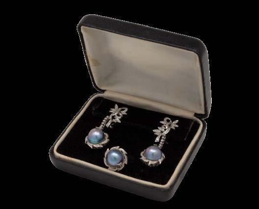 3 medias perlas color gris con un diámetro de 12.70 mm cada una, con 72 diamantes en talla sencilla con un peso estimado de 0.98 ct, blancos con detalles, diseñado en oro blanco de 10 ktes, sin sellos ni kintos.