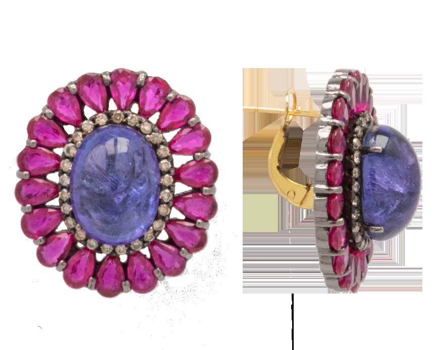 2 piedras centrales color moradas en talla cabujo con un diametro 9.10 x 12.55mm, 36 rubilitas en talla pera con un peso estimado 5.76 ct, 50 diamantes en talla brillante con un peso estimad ode 0.45 ct, con ligero color y detalles, diseñado en plata con raquetas en oro amarillo de 18 ktes, con sellos y kintos 18