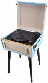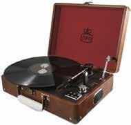 En spelare utöver det vanliga med tu� ny� u�örande med ”gummerad” yta. Spelar 33/45/78 varv. 2 inbyggda högtalare. Kan även kopplas in via RCA-utgångar �ll stereoanläggning. AUX-in 3,5mm så man kan koppla in sin telefon. AUX-ut 3,5 mm för hörlur eller externa ak�va högtalare. Ljudkablar ingår ej. LED-belyst volymkontroll. Må� 33x11,5x28cm.