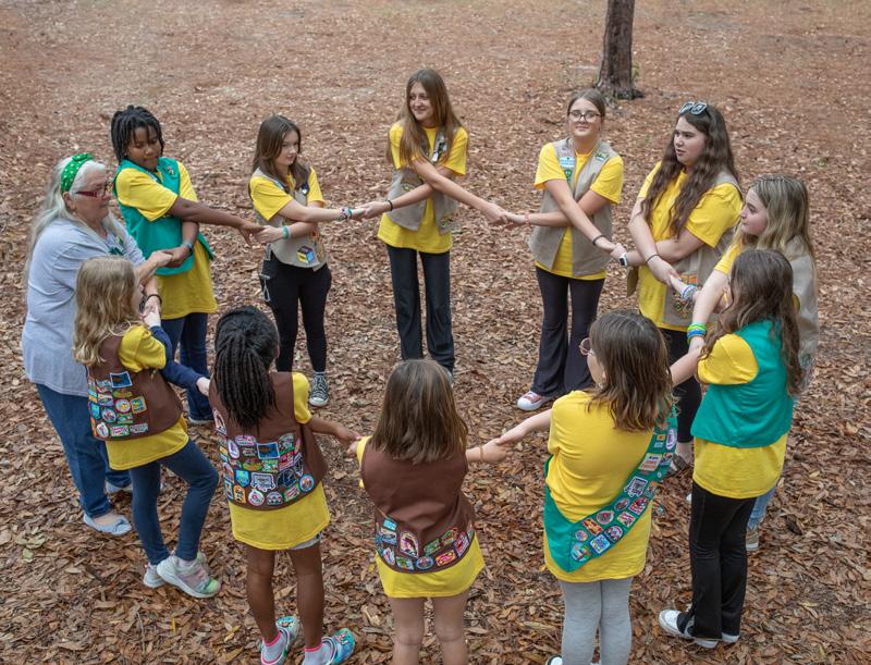 Representing the unbroken chain of friendship among Girl Scouts and Girl Guides around the world, the Friendship Circle involves Girl Scouts standing in a circle, crossing their right arms over their left, and clasping hands with their friends on both sides. Everyone then makes a silent wish as a friendship squeeze is passed from hand to hand around the circle.