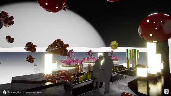 The proposal consists of the design of an intergalactic floating market. a space where the action unfolds among suspended platforms, mobile shelving, and gravitydefying structures. Inspired by the chaotic, colorful, and high-tech atmosphere of Guardians of the Galaxy, this market serves as a meeting point for species, cultures, and objects from the farthest reaches of the universe. In this visually overloaded and evershifting environment, a group of characters embarks on the search for a lost object essential to a secret mission, navigating a setting that seems to have a life of its own and hides more than it reveals.