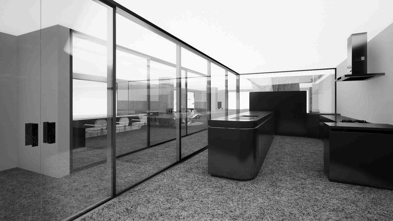 This elegant living and dining space embodies modern luxury through its dramatic marble countertop, whose bold veining and rich texture serve as the visual centerpiece of the room. Surrounded by sleek black steel details from the candleholders to the door frames and integrated lighting fixtures. the design strikes a perfect balance between sophistication and minimalism.